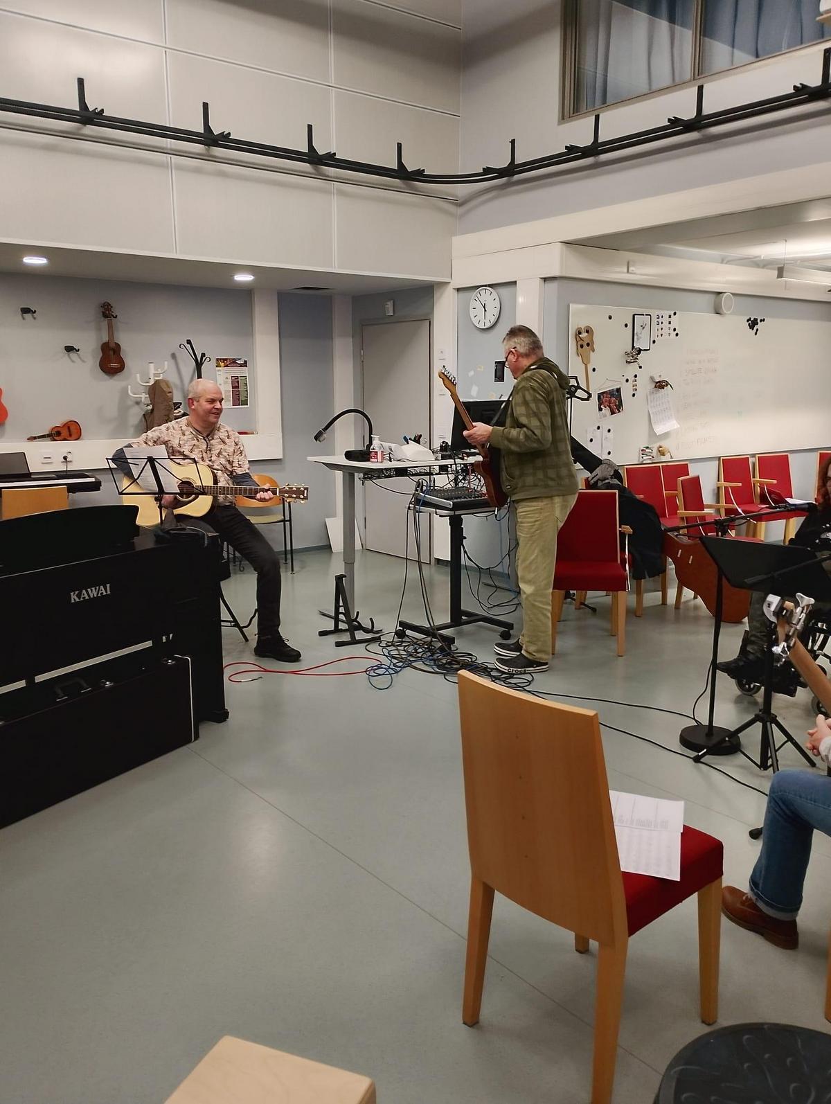 Jo ensimmäisissä treeneissä päästiin myös soittimien äärelle. Yhteinen tekeminen käynnistyi Pave Maijasen kappaleella Pidä huolta, jonka kautta haettiin rytmiä, kuuntelua ja yhdessä soittamisen meininkiä.